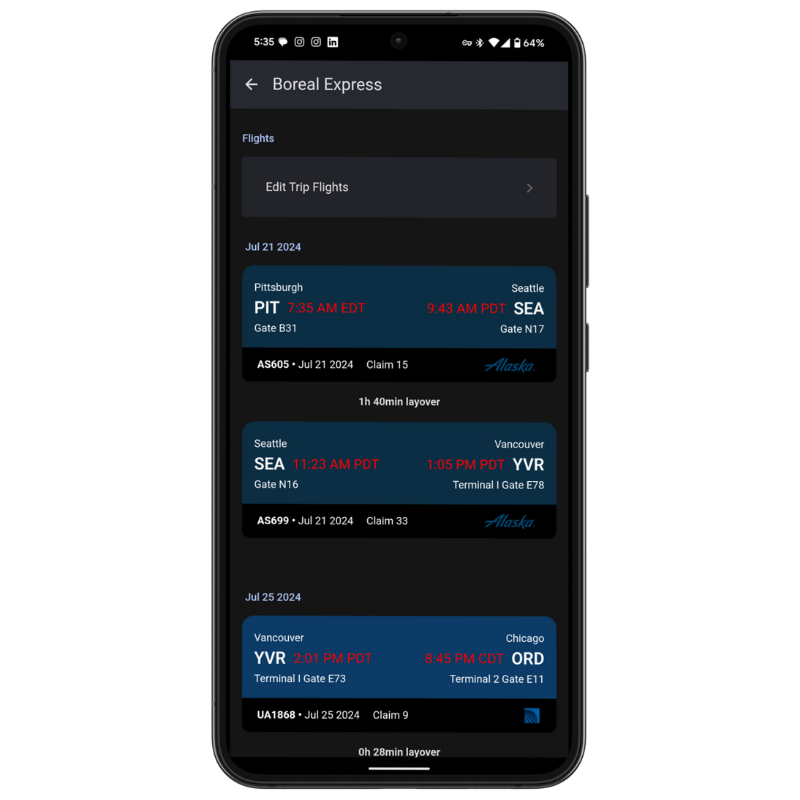 View flight timings, gates, baggage carousels, layover times, and more all on a single page.